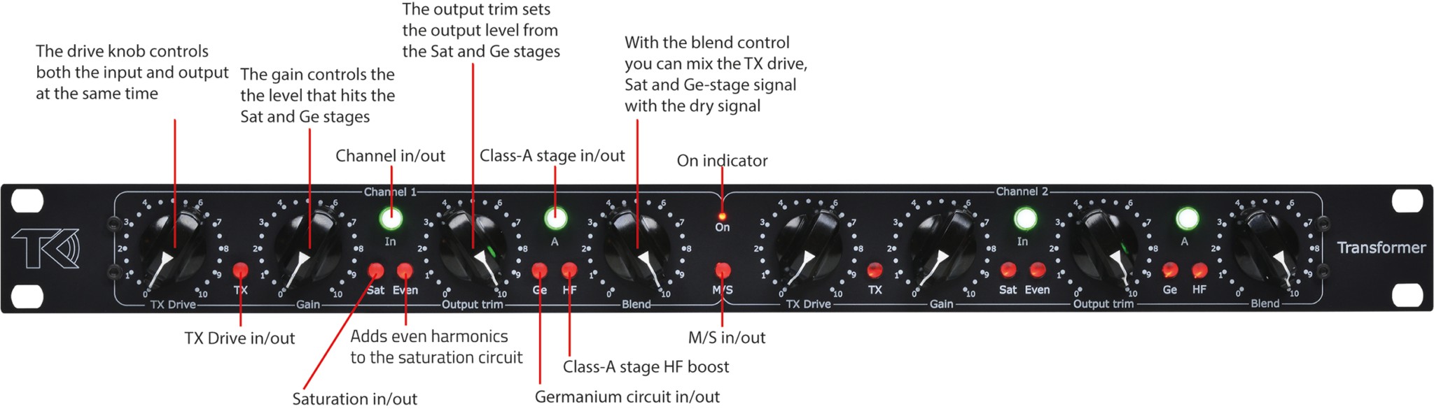 TK Audio proudly presents the Transceiver 2, a Swiss army knife both in studio and on stage. The main function is to convert balanced signals into unbalanced and back again without losing any signal quality. Each channel is equipped with a send level, return gain control, return polarity switch and a blend control. With the new added blend function you can choose how much of the inserted effect you want to add. The Transceiver 2 is a transformerless balanced design for the best possible signal handling, a flat frequency response and low harmonic distortion and noise.