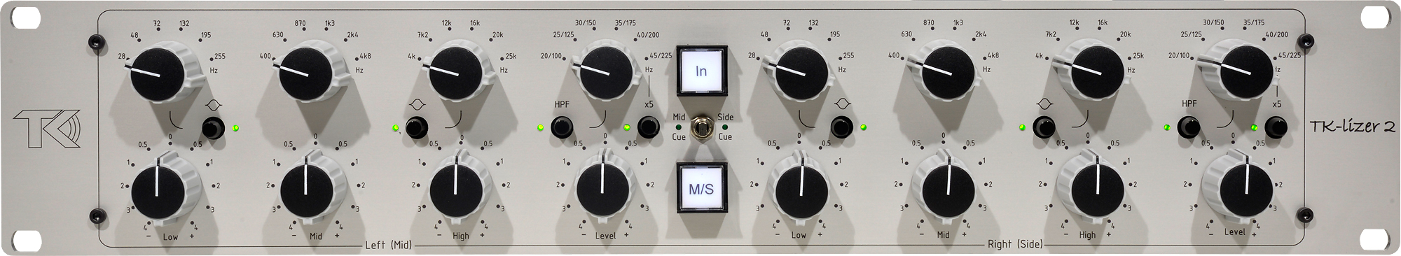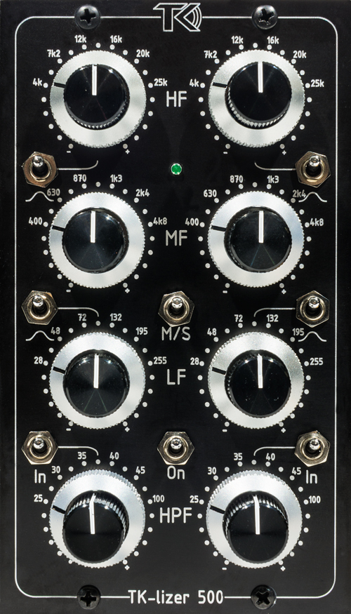 The TK-lizer 500 features all the power of the TK Audio s flagship TK-lizer, including the M/S functionality that has made it such a staple in studios all over the world. The three bands have a cut/boost range of +/-8dB in 41 steps. The low and high bands can be switched between peak or shelving mode. A high pass filter with a 12dB slope is also provided, and each channel has it s own level control with a range from infinity to +6dB. Using the built in M/S function, you can adjust the middle and side signals separately before it is decoded back to a normal L/R signal. In M/S mode you can also adjust the stereo width using the level controls.